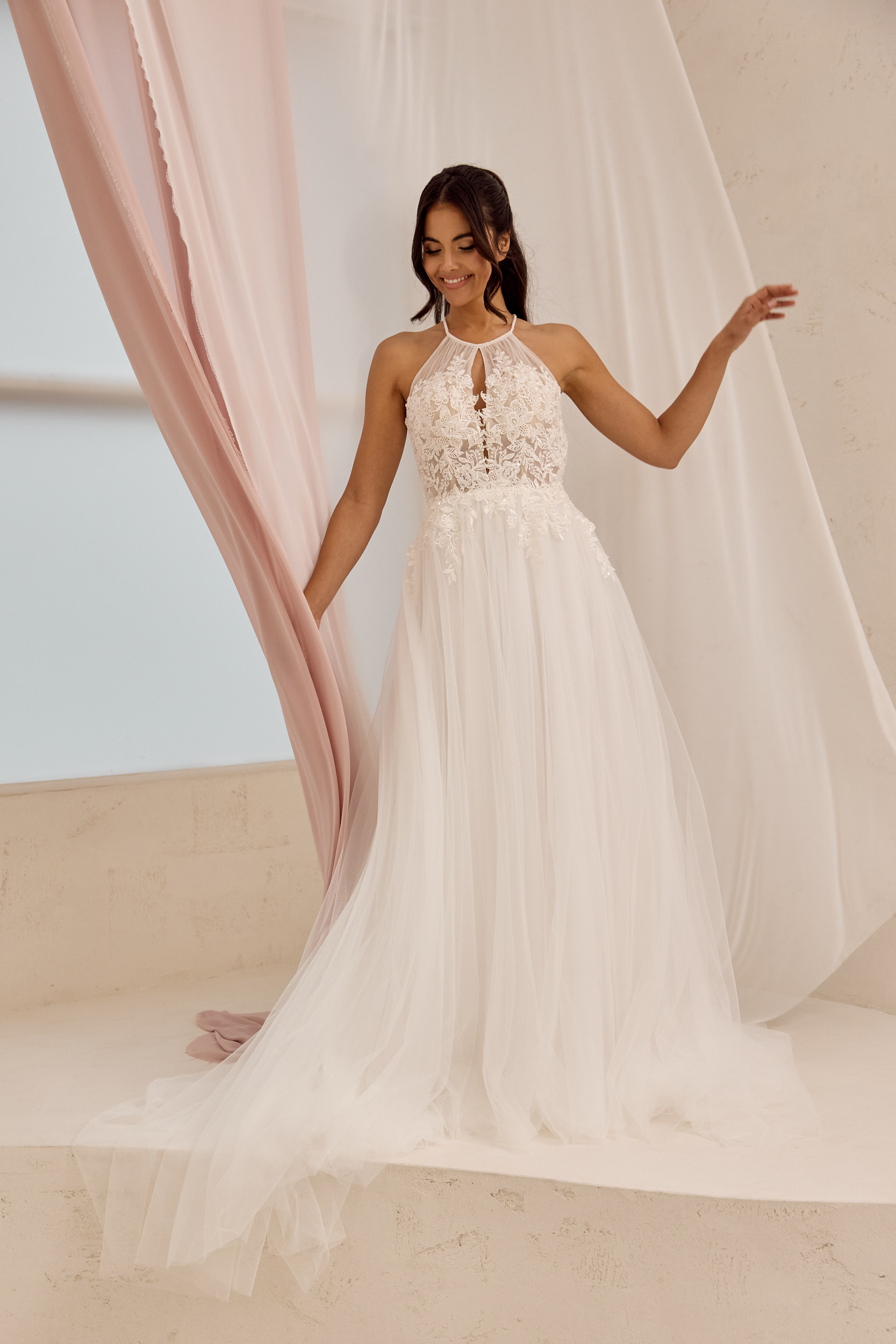 Fit and Flare Kleid aus Tüll mit floraler Spitze und Knopfleiste